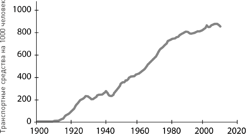 Рис. 5. Количество зарегистрированных автомобилей на 1000 человек в США с 1900 по 2010 год. Данные министерства энергетики США.