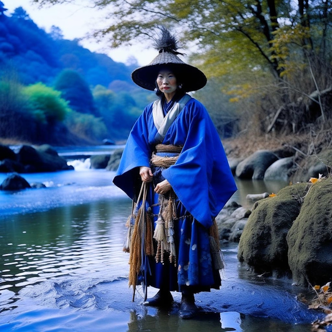 Теперь, когда женщина выпрямилась и шляпа больше не затеняла её лицо, Кен Джун смог её рассмотреть. Госпожа Мун Ква была уже немолодой. Лицо её покрывали белила, а щёки были ярко нарумянены. Синее платье из тяжелой ткани было подвёрнуто до костлявых колен, чтобы не замочить края. А с пояса свисали различные обереги, талисманы и прочие орнаментальные атрибуты.