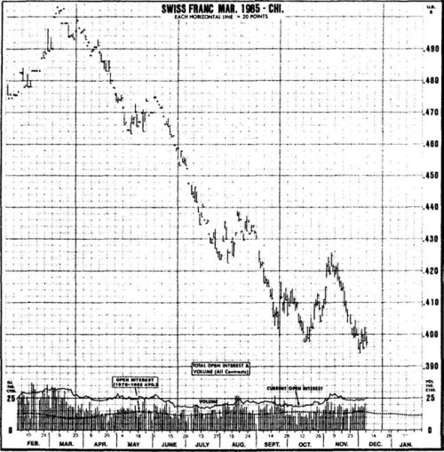 Рис. 1.4 Приверженцу теории «случайных событий» пришлось бы изрядно постараться, чтобы убедить трейдера, работающего со швейцарским франком, что никаких тенденций на самом деле не существует