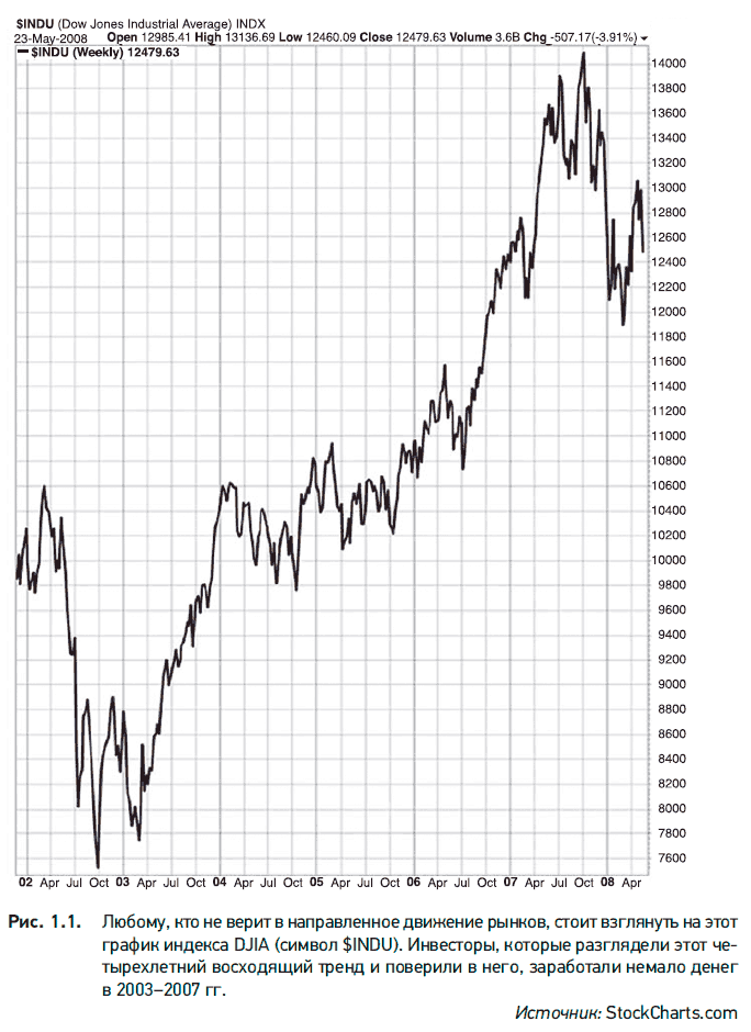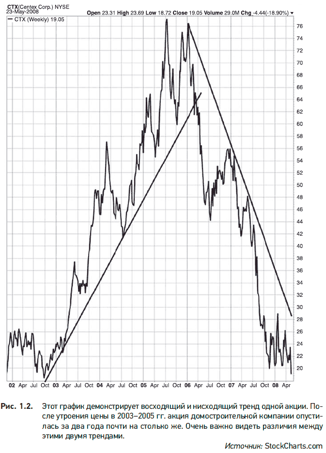 Вторая причина, по которой график работает, заключается в направленном движении рынков. Не верите? Тогда взгляните на график индекса Dow Jones Industrial Average (рис. 1.1). Если он не убеждает, то купите себе падающую акцию. Тогда вы сразу почувствуете нисходящий тренд. В исследовании тренда и состоит суть визуального анализа. Поэтому далее использование всех инструментов и индикаторов будет нацелено на одно: выявление тренда акции или рынка – восходящего или нисходящего. На рис. 1.2 показано, почему так важно понимать, куда все идет – вверх или вниз.