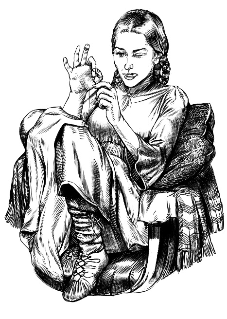 В мягком кресле цвета бурного моря сидела, подтянув колени к подбородку, сероглазая женщина с темными волосами, собранными из маленьких косичек в одну большую. Прищурив один глаз и высунув язык, она пыталась попасть ниткой в иглу, а меж колен зажимала мужскую рубаху. При виде Юлиана служанка подскочила, рассеянно улыбнулась и убрала так и не вдетую иглу с ниткой на низкий столик.