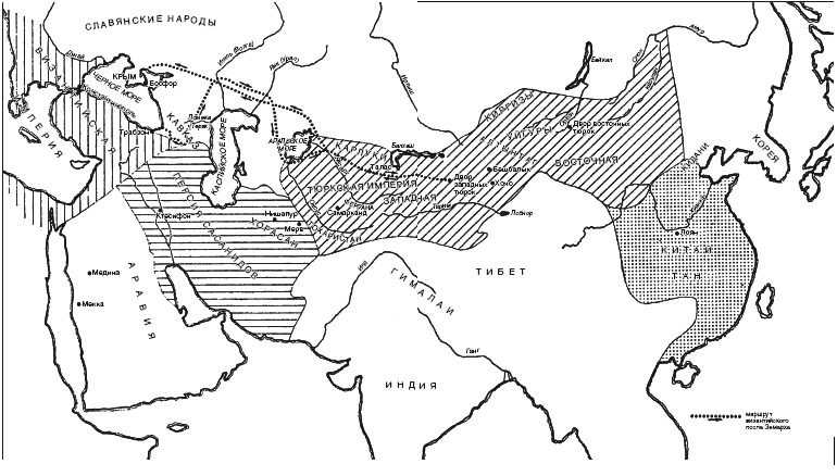 На востоке китайские беспорядки практически гарантировали продолжение тюркского правления: после падения династии Хань в III веке эта великая страна не знала мира и единства. Китайские династии, правившие к югу от Янцзы и Хуанхэ, находились в состоянии постоянной войны с двумя царствами Тоба на севере, которые фигурируют в династических анналах как Восточная и Западная Вэй. На западе тюрки, двигаясь за Аральское море к реке Оксус (Амударья), столкнулись с эфталитами – белыми гуннами, с 430 года владевшими греческим царством Бактрия и восточными марками иранского мира, возврат которых был постоянной целью персидской политики. Истеми, ябгу запада, обошелся с эфталитами так же, как его брат с жужанами. Он предложил союз Персии, где в то время правил могущественный Хосров Нуширван (Ануширван). Его дружба и дочь были приняты с радостью. В период между 563 и 567 годами была организована совместная кампания, и эфталиты, оказавшиеся между двух огней, были разбиты. Победители разделили трофеи: Хосров получил давно утраченную провинцию Хорасан, а Истеми аннексировал Согдиану, богатую и плодородную землю за Оксусом, через которую везли шелк из Китая на западные рынки.