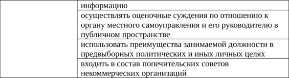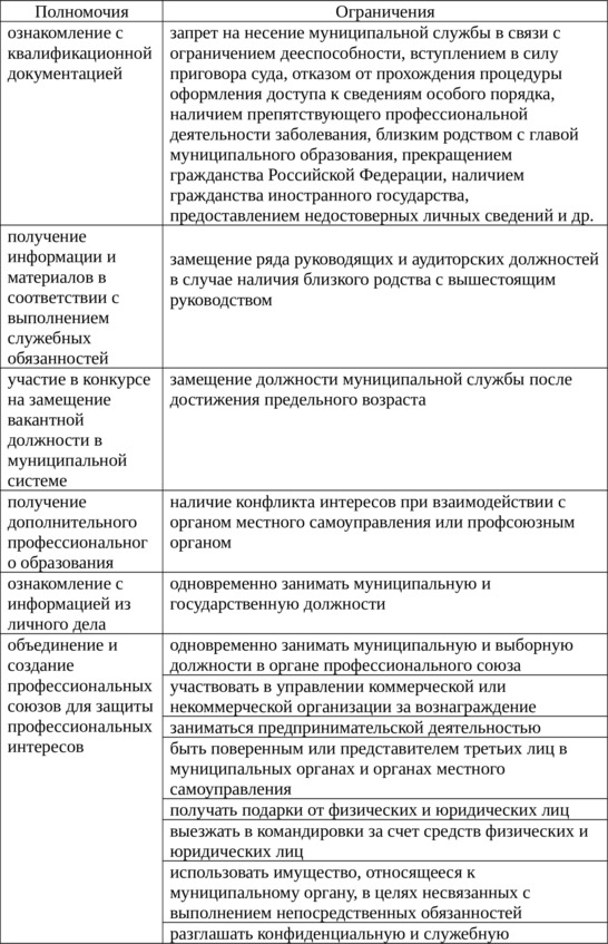 В Таблице 1 представлены полномочия и ограничения, установленные профильным законодательством для муниципальных служащих.
