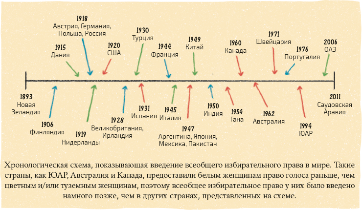 Политика часто представляется нам каким-то особым миром: мы спорим о нем в соцсетях, но он все равно идет своим путем, благоухая отнюдь не розами, и не обращает внимания на протесты или насмешки в интернете. Да и праву людей выражать свое мнение по политическим вопросам не так много лет. В Исландии, на родине старейшего в мире парламента (альтинга), начали прислушиваться к мнению «всех свободных мужей» с 930 года, и такое представление о «демократии» стало образцом для всех последующих парламентов. Людям с другим цветом кожи, женщинам и рабам всюду отказывали в праве участвовать в псевдодемократическом процессе. (Как замечает историк-феминистка Эстель Фридман, в Африке и Латинской Америке до колонизации женщины обладали почти полным равенством, но лишились его, когда европейцы навязали захваченным странам собственную систему.)