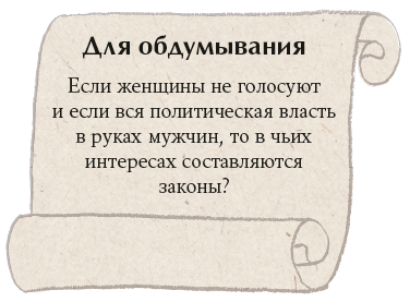 Кэди Стэнтон и Панкхёрст утверждали, что возможность голосовать позволит женщинам участвовать в решении самых разных вопросов: право на труд и его справедливую оплату, на собственность и телесный суверенитет (возможность распоряжаться собственным телом), на защиту от любой физической агрессии, в том числе и от нападений мужей. Но женщины всего мира до сих пор сражаются за эти права. Только 22 % парламентариев по всему миру – женщины, а это означает, что мужчины по-прежнему повсюду контролируют процесс законотворчества. И хотя сегодня всюду (за исключением Ватикана) женщинам разрешено голосовать, где-то это право жестко ограничено. В Саудовской Аравии женщины голосуют с 2015 года, но по-прежнему не могут обращаться в государственные службы без разрешения мужчины. Французские женщины были лишены права голоса до 1944 года, но к началу XXI века их влияние возросло настолько, что они добились принятия закона о политическом паритете, согласно которому места в списках кандидатов делятся поровну между мужчинами и женщинами. Это привело к увеличению количества женщин, выставляющих свои кандидатуры и избираемых на государственные должности, и к равному распределению министерских портфелей в правительстве в 2012 году. Французские феминистки считают, что начало положено, но уверены: впереди еще долгий путь. Анн Идальго, первая женщина на посту мэра Парижа за всю историю города, так и заявила в своей победной речи: «Я понимаю, какие меня ждут сложности».