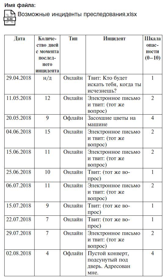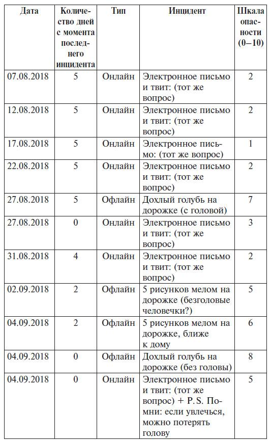 Ясно одно: если ей не мерещится и кто-то впрямь подкидывает мертвые цветы и дохлых голубей, то ситуация обостряется. Набирает обороты. Нужно каким-то образом отследить события, собрать данные и посмотреть, есть ли между ними связь: действительно ли ее кто-то преследует, или она окончательно сходит с ума? Например, можно составить таблицу.
