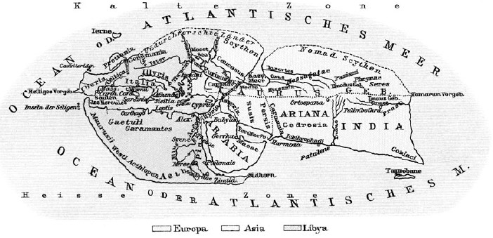 На карте мира Страбона, воссозданной в XIX веке в Германии, вся суша разделена на три континента: Европу, Азию и Ливию (так греки называли Африку). Такое разделение (между Европой и Азией довольно условное) сохраняется по сей день.
