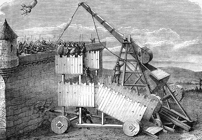 В течение почти 2000 лет требюшет был одним из самых грозных оружий на войне. Эта, по сути, обычная катапульта работала по принципу рычага и бросала камни или горящие снаряды на вражеских солдат или на оборонительные укрепления при осаде. Мускульные требюшеты впервые использовались в Китае в IV в. до н. э. Они зависели примерно от дюжины человек, которым нужно было тянуть канаты, чтобы высвободить вращающееся плечо рычага, которое могло метнуть снаряд на 125 м. Требюшеты с противовесом, которые запускались падающим грузом, были изобретены в Европе в XII в. К XV в. они могли поражать цели на расстоянии 420 м, но к тому времени их дни были сочтены. Наступала эра пушек.