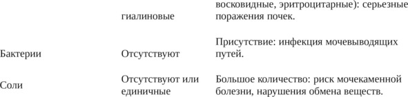 – Цилиндры. Бывают гиалиновыми (норма в небольшом количестве) или патологическими (зернистые, восковидные, эритроцитарные, лейкоцитарные), свидетельствующими о серьезных поражениях почек.