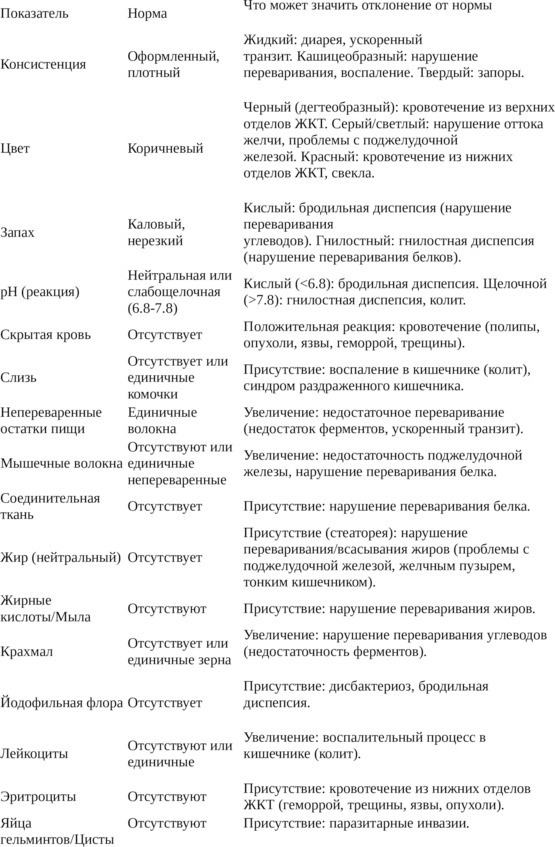 Кал – это конечный продукт переваривания пищи. Его анализ, известный как копрограмма, позволяет оценить работу всего желудочно-кишечного тракта: от желудка и поджелудочной железы до кишечника. Он помогает выявить нарушения переваривания, воспалительные процессы, кровотечения и наличие паразитов.