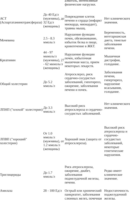 – АЛТ и АСТ – ферменты печени. Повышаются при гепатитах, жировой болезни печени, от алкоголя или лекарств. Иногда – от физнагрузки.