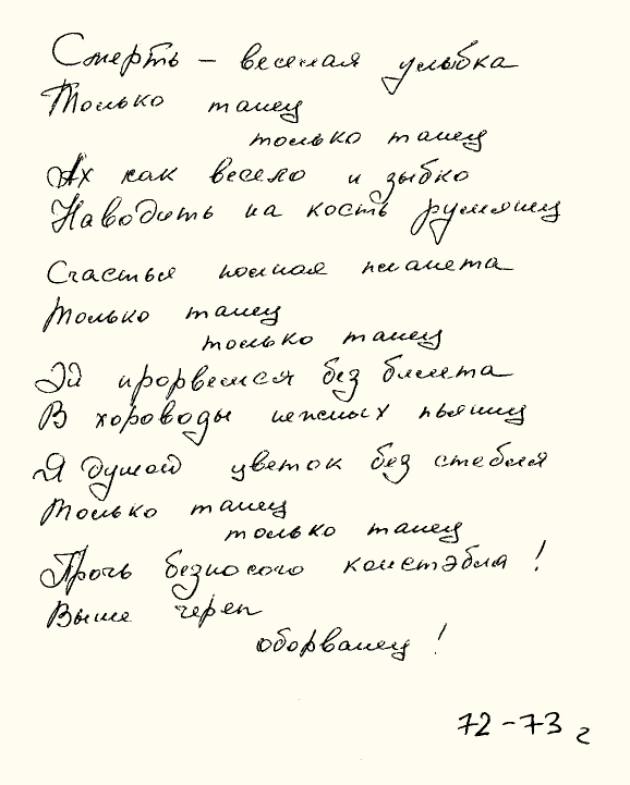 Смерть – весёлая улыбкаТолько танец$$$$$$$$только танецАх, как весело и зыбкоНаводить на кость румянецСчастья полная планетаТолько танец$$$$$$$$только танецЭй, прорвёмся без билетаВ хороводы нежных пьяницЯ душой цветок без стебляТолько танец$$$$$$$$только танецПрочь безносого констебля!Выше череп,$$$$$$$$оборванец!1972–1973