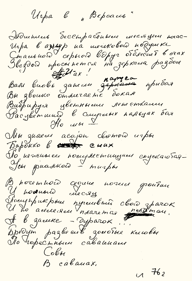 …Я же за тенью тенейТихо летел по острогамТёмная память о нейПодсчитана строгоНо только вижу сон:В саду колоколаВсё ближе к паперти задумчивый ДодонКровавым мальчиком вдруг поперхнулся сумракШесть великолепий в блестящей шерстиПод белые руки ведут меня в зероКарминное – знак шакалаВ карманном зеркальце лести1975Игра в «Версаль»