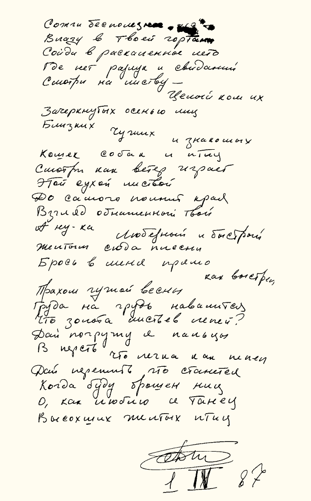 Сожги бесполезное «это» —Влагу в твоей гортаниСойди в раскалённое летоГде нет разлук и свиданийСмотри на листву —$$$$$$$$$$целый ком их,Зачёркнутых осенью лицБлизких$$$$$$чужих$$$$$$$$$$и знакомыхКошек, собак и птицСмотри, как ветер играетЭтой сухой листвойДо самого полнит краяВзгляд обнажённый твойА ну-ка,$$$$$любезный и быстрый,Жёлтым сюда плесни!Брось в меня прямо$$$$$$$$$$как выстрелПрахом чужой весныГруда на грудь навалитсяЧто золота листьев лепей?Дай, погружу я пальцыВ персть,$$$$$что легка, как пепел,Дай пережить, что станется,Когда буду брошен ницО, как люблю я танецВысохших жёлтых птиц…01.04.1987