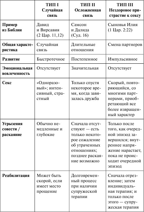 В таблице «Три типа внебрачных связей» дается характеристика этим связям. В каждой конкретной ситуации может происходить смешение трех типов, но в целом, прежде чем выбрать соответствующую терапию, связь нужно отнести к одной определенной категории.
