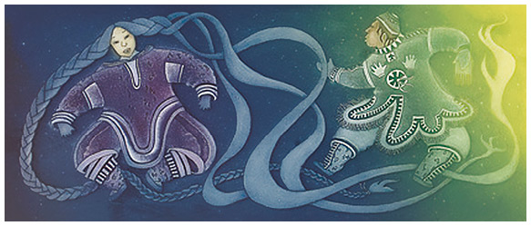 Когда-то дух луны был Игалуком – слепым мальчиком, который приобрел «второе зрение» благодаря утке-гагаре, заманившей его на лодке в море. После того как он и его сестра Малина поднялись на небеса, они бегали друг за другом по небу, словно солнце и луна. Ночная Луна – это и есть Игалук, который пересекает ледяной небосвод на собачьей упряжке сквозь метели из облаков. Он могучий охотник и добрый защитник своего царства вокруг северных гор.