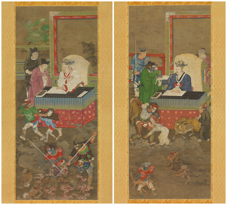 Эта тема превращает индийский буддийский взгляд на приговор после смерти в типично китайский бюрократический процесс. Прежде чем получить разрешение на переселение в следующую жизнь, душу каждую неделю в течение семи недель судит другой король; ее посылают восьмому королю на сотый день, девятому – через год, а десятому – на третий год после смерти. Здесь в каждом свитке изображен король, которому помогают писец и другие чиновники, осматривающий и выносящий приговор душам умерших; на переднем плане демоны наказывают нечестивцев. The Metropolitan Museum of Art (Public Domain)