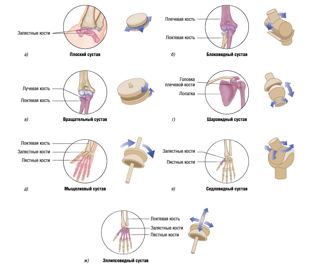 Рисунок 2.19. Типы синовиальных суставов: а) плоский; б) блоковидный; в) вращательный; г) шаровидный; д) мыщелковый; е) седловидный; ж) эллипсовидный