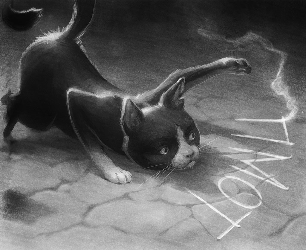 Миновав дверь на другом конце обеденного зала, Элдвин продолжил путь по коридору. Скайлар все держала иллюзию; кот с друзьями на спине направился к главному входу.