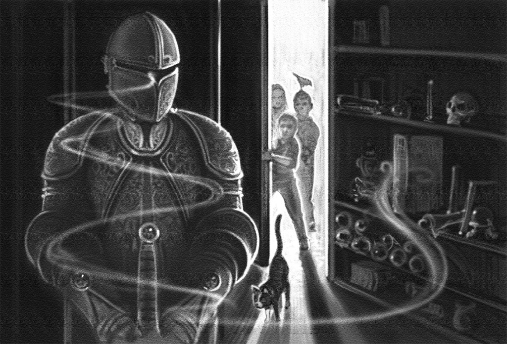 На стене висели доспехи – и что-то в них было такое… особенно жуткое. Элдвин только их увидел, и у него сразу шерсть встала дыбом. Цвета они были белого, как кости, а из-под забрала вырывался пар, словно внутри кто-то все еще дышал. На лбу шлема поблескивал дымчатый бриллиант. Судя по углублениям на перчатках и на нагруднике, бриллиантов когда-то было четыре: один на шлеме, один на нагруднике и по одному на каждой руке. А ведь шлем-то знакомый, удивился про себя Элдвин. Он из того видения, что показала фамильярам пой-трава, когда они втроем шли по следам Баксли в поисках Ирбисовой Короны. То была история о первом Восстании Мертвецов. И шлем этот носил один из двух темных магов-предводителей Армии Мертвых – то ли Виверн, то ли Череп, тут Элдвин точно не знал. Но чьи бы ни были эти проклятые доспехи, от них так и веяло злом.