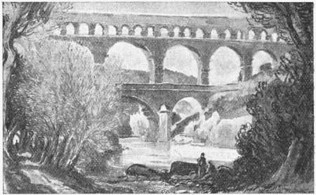 The Pont du GardIT was a pleasure to feel one's self in Provence again—the land where the silver-grey earth is impregnated with the light of the sky. To celebrate the event, as soon as I arrived at Nîmes I engaged a calèche to convey me to the Pont du Gard. The day was yet young and was exceptionally fair; it appeared well, for a longish drive, to take advantage, without delay, of such security. After I had left the town I became more intimate with that Provençal charm which I had already enjoyed from the window of the train, and which glowed in the sweet sunshine and the white rocks and lurked in the smoke puffs of the little olives. The olive-trees in Provence are half the landscape. They are neither so tall, so stout, nor so richly contorted as you have seen them beyond the Alps; but this mild colourless bloom seems the very texture of the country. The road from Nîmes, for a distance of fifteen miles, is superb; broad enough for an army and as white and firm as a dinner-table. It stretches away over undulations which have a kind of rhythmic value, and in the curves it makes through the wide, free country, where there is never a hedge or a wall and the detail is always exquisite, there is something majestic, almost processional. Some twenty minutes before I reached the little inn that marks the termination of the drive my vehicle met with an accident which just missed being serious, and which engaged the attention of a gentleman who, followed by his groom and mounted on a strikingly handsome horse, happened to ride up at the moment. This young man, who, with his good looks and charming manner, might have stepped out of a novel of Octave Feuillet, gave me some very intelligent advice in reference to one of my horses that had been injured, and was so good as to accompany me to the inn, with the resources of which he was acquainted, to see that his recommendations were carried out. The result of our interview was that he invited me to come and look at a small but ancient château in the neighbourhood, which he had the happiness—not the greatest in the world, he intimated—to inhabit, and at which I engaged to present myself after I should have spent an hour at the Pont du Gard. For the moment, when we separated, I gave all my attention to that great structure. You are very near it before you see it; the ravine it spans suddenly opens and exhibits the picture. The scene at this point grows extremely beautiful. The ravine is the valley of the Garden, which the road from Nîmes has followed some time without taking account of it, but which, exactly at the right distance from the aqueduct, deepens and expands and puts on those characteristics which are best suited to give it effect.
