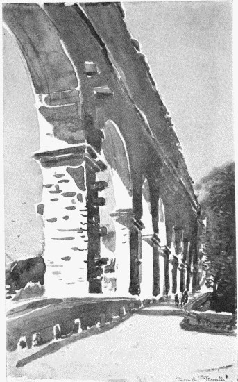 The gorge becomes romantic, still and solitary, and, with its white rocks and wild shrubbery, hangs over the clear-coloured river, in whose slow course there is, here and there, a deeper pool. Over the valley, from side to side and ever so high in the air, stretch the three tiers of the tremendous bridge. They are unspeakably imposing, and nothing could well be more Roman. The hugeness, the solidity, the unexpectedness, the monumental rectitude of the whole thing leave you nothing to say—at the time—and make you stand gazing. You simply feel that it is noble and perfect, that it has the quality of greatness. A road, branching from the highway, descends to the level of the river and passes under one of the arches. This road has a wide margin of grass and loose stones, which slopes upward into the bank of the ravine. You may sit here as long as you please, staring up at the light, strong piers; the spot is sufficiently "wild," though two or three stone benches have been erected on it. I remained there an hour and got a complete impression; the place was perfectly soundless and, for the time at least, lonely; the splendid afternoon had begun to fade, and there was a fascination in the object I had come to see. It came to pass that at the same time I discovered in it a certain stupidity, a vague brutality. That element is rarely absent from great Roman work, which is wanting in the nice adaptation of the means to the end. The means are always exaggerated; the end is so much more than attained. The Roman rigour was apt to overshoot the mark, and I suppose a race which could do nothing small is as defective as a race that can do nothing great. Of this Roman rigour the Pont du Gard is an admirable example. It would be a great injustice, however, not to insist upon its beauty—a kind of manly beauty, that of an object constructed not to please but to serve, and impressive simply from the scale on which it carries out this intention. The number of arches in each tier is different; they are smaller and more numerous as they ascend. The preservation of the thing is extraordinary; nothing has crumbled or collapsed; every feature remains, and the huge blocks of stone, of a brownish-yellow (as if they had been baked by the Provençal sun for eighteen centuries), pile themselves, without mortar or cement, as evenly as the day they were laid together. All this to carry the water of a couple of springs to a little provincial city! The conduit on the top has retained its shape and traces of the cement with which it was lined. When the vague twilight began to gather, the lonely valley seemed to fill itself with the shadow of the Roman name, as if the mighty empire were still as erect as the supports of the aqueduct; and it was open to a solitary tourist, sitting there sentimental, to believe that no people has ever been, or will ever be, as great as that, measured, as we measure the greatness of an individual, by the push they gave to what they undertook. The Pont du Gard is one of the three or four deepest impressions they have left; it speaks of them in a manner with which they might have been satisfied.
