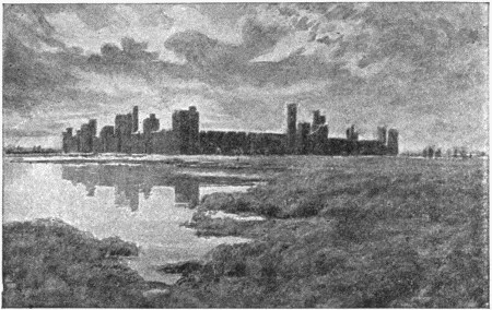 Within a certain distance of Aigues-Mortes they give place to wide salt-marshes, traversed by two canals; and over this expanse the train rumbles slowly upon a narrow causeway, failing for some time, though you know you are near the object of your curiosity, to bring you to sight of anything but the horizon. Suddenly it appears, the towered and embattled mass, lying so low that the crest of its defences seems to rise straight out of the ground; and it is not till the train stops close before them that you are able to take the full measure of its walls.