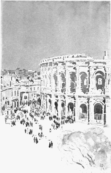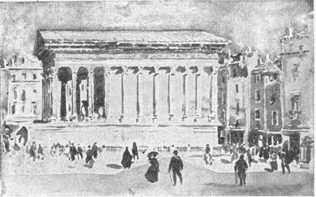 NîmesAFTER this I was free to look about me at Nîmes, and I did so with such attention as the place appeared to require. At the risk of seeming too easily and too frequently disappointed, I will say that it required rather less than I had been prepared to give. It is a town of three or four fine features rather than a town with, as I may say, a general figure. In general Nîmes is poor; its only treasures are its Roman remains, which are of the first order. The new French fashions prevail in many of its streets; the old houses are paltry, and the good houses are new; while beside my hotel rose a big spick-and-span church, which had the oddest air of having been intended for Brooklyn or Cleveland. It is true that this church looked out on a square completely French—a square of a fine modern disposition, flanked on one side by a classical palais de justice embellished with trees and parapets and occupied in the centre with a group of allegorical statues such as one encounters only in the cities of France, the chief of these being a colossal figure by Pradier representing Nîmes. An English, an American town which should have such a monument, such a square as this would be a place of great pretensions; but, like so many little villes de province in the country of which I write, Nîmes is easily ornamental. What nobler element can there be than the Roman baths at the foot of Mont Cavalier and the delightful old garden that surrounds them? All that quarter of Nîmes has every reason to be proud of itself; it has been revealed to the world at large by copious photography. A clear, abundant stream gushes from the foot of a high hill (covered with trees and laid out in paths), and is distributed into basins which sufficiently refer themselves to the period that gave them birth—the period that has left its stamp on that pompous Peyrou which we admired at Montpellier. Here are the same terraces and steps and balustrades, and a system of waterworks less impressive perhaps, but very ingenious and charming. The whole place is a mixture of old Rome and of the French eighteenth century; for the remains of the antique baths are in a measure incorporated in the modern fountains. In a corner of this umbrageous precinct stands a small Roman ruin, which is known as a temple of Diana, but was more apparently a nymphæum, and appears to have had a graceful connection with the adjacent baths. I learn from Murray that this little temple, of the period of Augustus, "was reduced to its present state of ruin in 1577;" the moment at which the townspeople, threatened with a siege by the troops of the Crown, partly demolished it lest it should serve as a cover to the enemy. The remains are very fragmentary, but they serve to show that the place was lovely. I spent half an hour in it on a perfect Sunday morning (it is enclosed by a high grille, carefully tended, and has a warden of its own), and with the help of my imagination tried to reconstruct a little the aspect of things in the Gallo-Roman days. I do wrong perhaps to say that I tried; from a flight so deliberate I should have shrunk. But there was a certain contagion of antiquity in the air; and among the ruins of baths and temples, in the very spot where the aqueduct that crosses the Gardon in the wondrous manner I had seen discharged itself, the picture of a splendid paganism seemed vaguely to glow. Roman baths—Roman baths; those words alone were a scene. Everything was changed: I was strolling in a jardin français; the bosky slope of the Mont Cavalier (a very modest mountain), hanging over the place, is crowned with a shapeless tower, which is as likely to be of mediæval as of antique origin; and yet, as I leaned on the parapet of one of the fountains, where a flight of curved steps (a hemicycle, as the French say) descended into a basin full of dark, cool recesses, where the slabs of the Roman foundations gleam through the clear green water—as in this attitude I surrendered myself to contemplation and reverie, it seemed to me that I touched for a moment the ancient world. Such moments are illuminating, and the light of this one mingles, in my memory, with the dusky greenness of the Jardin de la Fontaine.