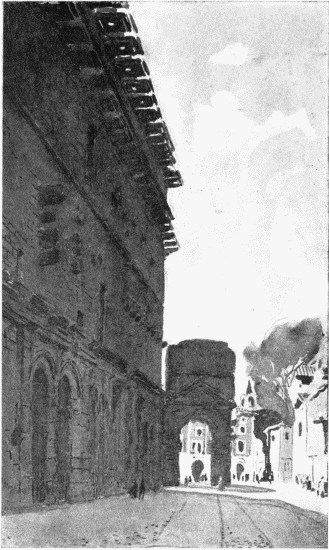 "Presenting Thebes' or Pelops' line."At Orange either end of the stage, coming forward, is an immense wing—immense in height, I mean, as it reaches to the top of the scenic wall; the other dimensions are not remarkable. The division to the right, as you face the stage, is pointed out as the green-room; its portentous altitude and the open arches at the top give it the air of a well. The compartment on the left is exactly similar, save that it opens into the traces of other chambers, said to be those of a hippodrome adjacent to the theatre. Various fragments are visible which refer themselves plausibly to such an establishment; the greater axis of the hippodrome would appear to have been on a line with the triumphal arch. This is all I saw, and all there was to see, of Orange, which had a very rustic, bucolic aspect, and where I was not even called upon to demand breakfast at the hotel. The entrance of this resort might have been that of a stable of the Roman days.