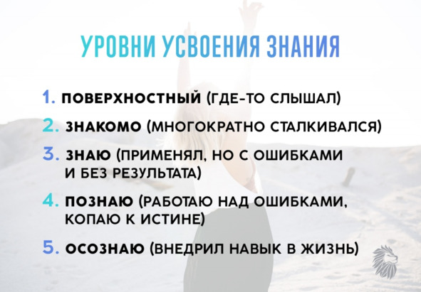 Некоторые люди, например, говорят, что знают материалы курса по отношениям в Психомагии. Когда такого человека спрашиваешь, уверен ли он, что знает информацию по отношениям, он говорит: «Конечно, знаю: я смотрел ваши бесплатные вебинары по этой теме, и мне эта информация известна, знакома. Вы рассказываете, что не нужно привязываться к человеку. Я же всё это знаю. Вы говорите, что нужно выстраивать уважительные отношения с родителями, родными и близкими. Я и это тоже знал». Человек, который обладает, как он считает, знаниями высшего уровня, на самом деле обладает всего лишь знанием третьего уровня, потому что он не перешел на четвертый и пятый этап.