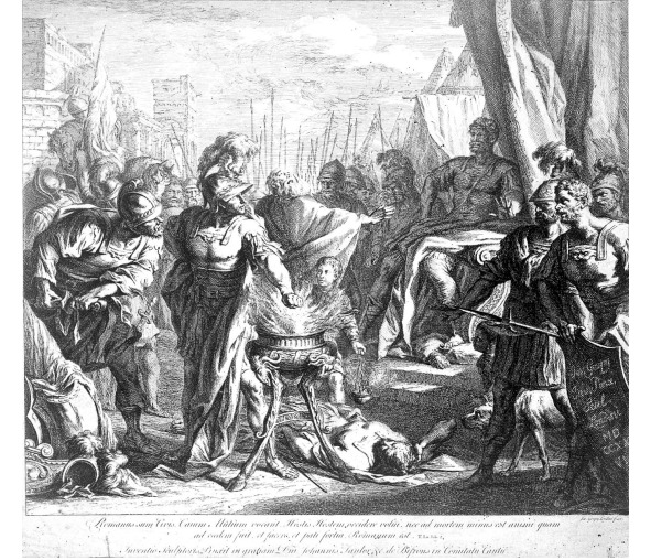 Шесть стражников и два карабинёране сводят глаз с лазутчика в цепях,наш Муцио Сцевола, брат-монах,ждёт приговор этрусского Приора. Престол Порсенны – вершие агорынад Альба-Лонгой в варварских шатрах.«Ты кто, моншер, откель в моих краях? —спрошает Царь, – и что тут за гоморра?» Тот: «Я, Пресвят-Владыко, Муццевола,левша, взамен тебя убил писца:смутил богатый пурпур камизолы». Впредь бей не изразец, а черепицу;спужался враг гвардейца-храбреца:не тронул пламень длань стальной десницы.Альбано – область (наименование озера и гор) к югу от Рима (античная Альба-Лонга)