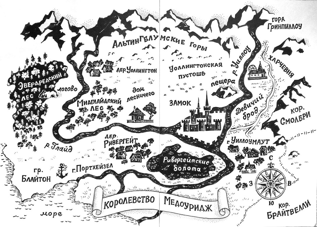 Королевство Медоуридж располагалось в долине реки Глайд с притоками Уиллоу, Стоунбрейк и Твиг к югу от Альтингблумских гор, в которых брали начало эти реки. Горы были труднодоступными, хотя и невысокими: даже на вершине Гринпиллоу, получившей свое название из-за формы, издали напоминавшей квадратную подушку, снег не лежал круглый год, зато в ложбине между двумя «углами подушки» пряталось озеро Чилли, из которого вытекала река Уиллоу. В западном отроге Альтингблумского хребта находилось другое озеро – Альтингблум, из которого вытекал полноводный Глайд.