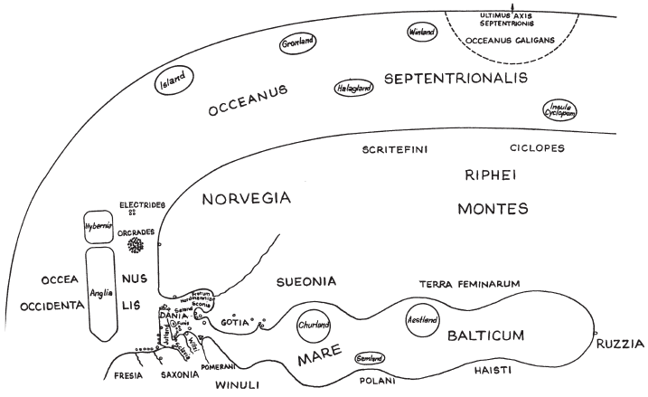 Карта отражает представления Адама Бременского. Здесь приведена по А. Бьёрнбо