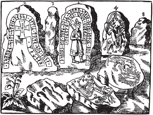 Рис 10. Камни с резными изображениями и руническими надписями в Сконе (Оле Ворм)