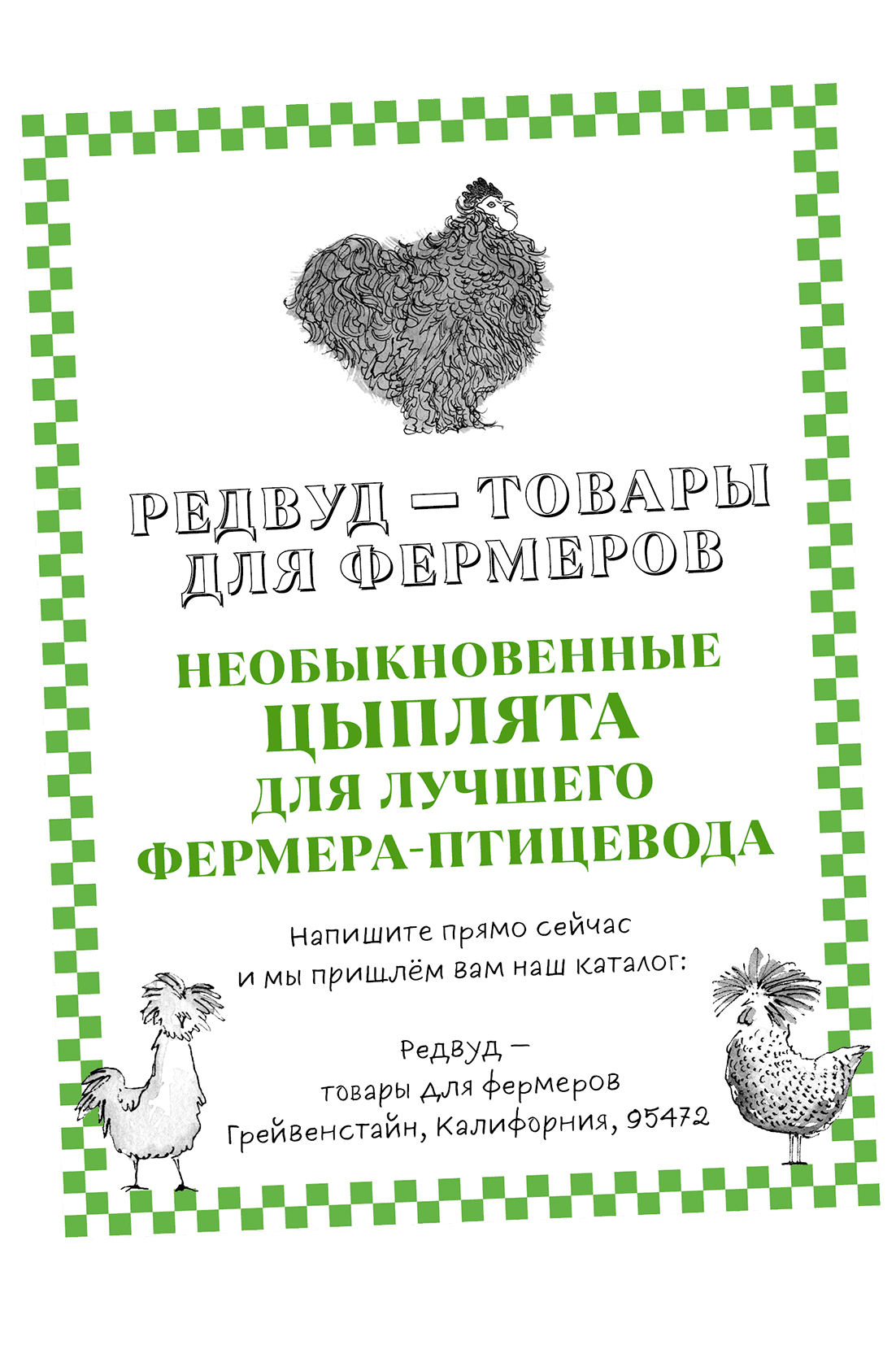 Сколько я ни искала, не смогла найти ваш сайт, так что мама посоветовала мне написать вам письмо и заказать каталог. В вашем проспекте написано, что вы поставляете «Необыкновенных кур для лучших фермеров». А что такого особенного в этих необыкновенных курах? Пожалуйста, пришлите мне каталог, чтобы я смогла разобраться.