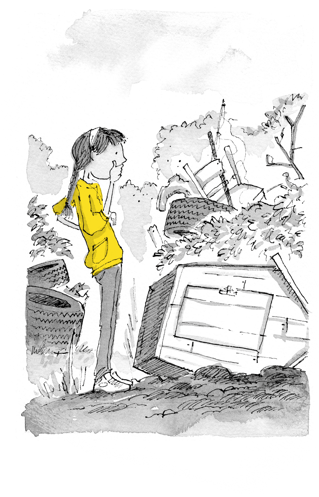 Двоюродный дедушка Джим оставил горы мусора по всему двору – под большими деревьями и за домами. Сперва я хотела рассортировать их, потому что во всём люблю порядок. Но, протащив по грязи примерно двадцать шин, отказалась от этой затеи. (Всё-таки интересно, откуда у дедушки столько шин? Может быть, это друзья ему свои подбрасывали? А он этого даже не замечал. Но зачем хранить половину двери холодильника и пять ржавых дорожных знаков «стоп»? Да и вряд ли их можно уносить домой, даже если они валяются на дороге.)