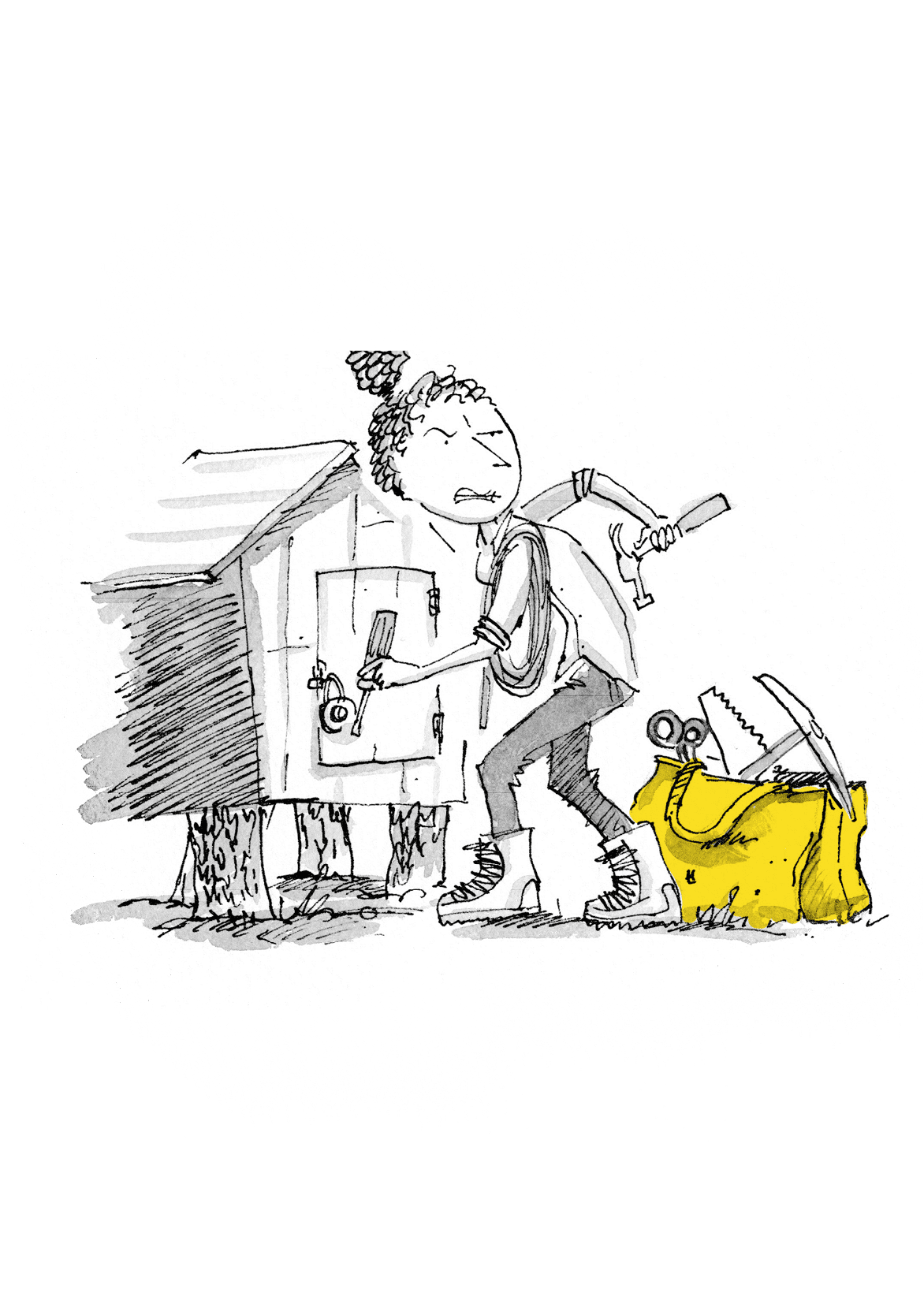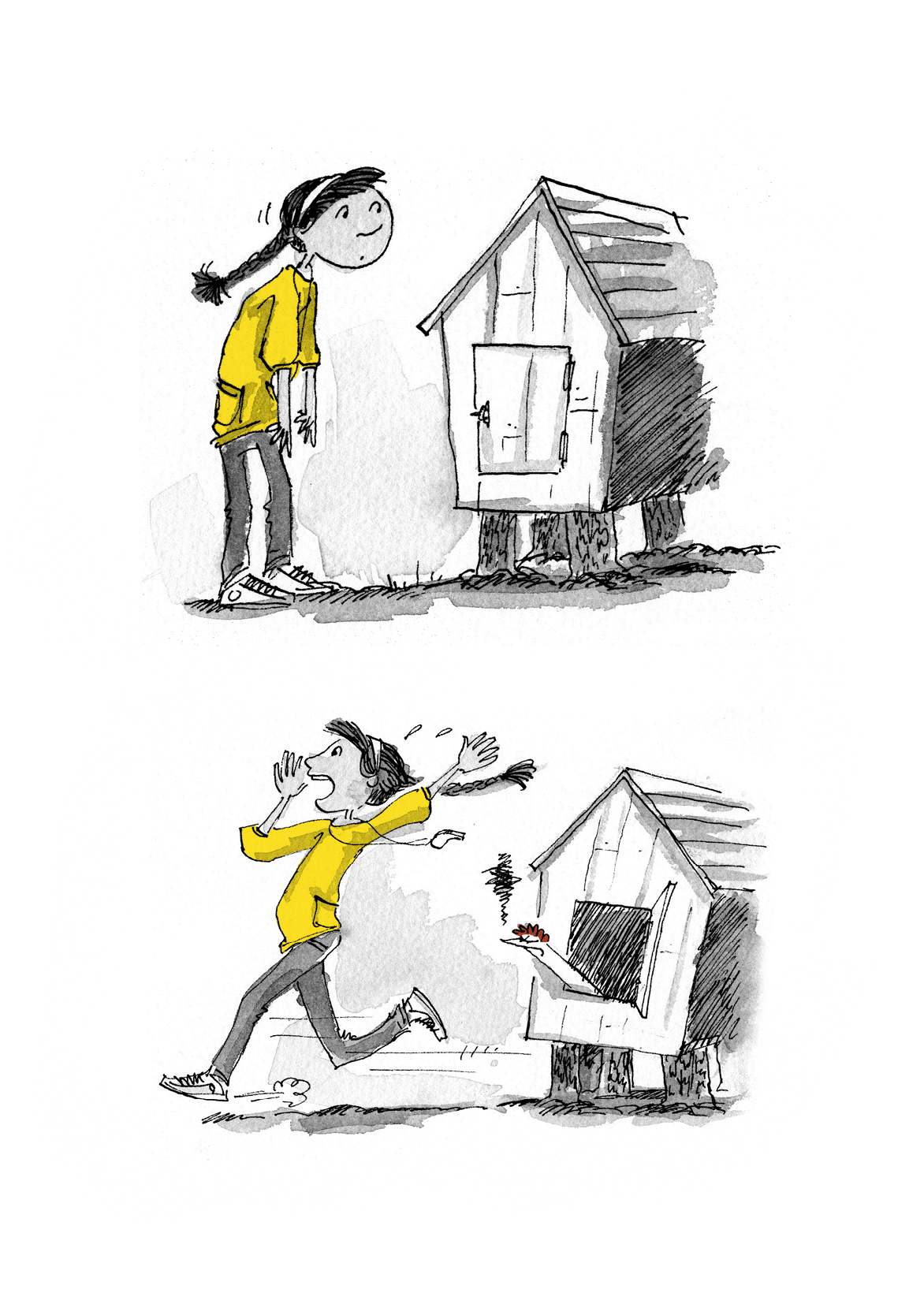Во-первых, утром домик-курятник оказался не там, где я его вчера вечером оставила. Теперь он стоит на четырёх пеньках и очень крепко на них держится. Я сперва решила, что это папа его перенёс (мама всё время работает и почти не выходит из дома), и не на шутку встревожилась, ведь я не рассказывала родителям о курице. Но потом вспомнила, что папа сразу после завтрака уехал в город. К тому же дверь была заперта на засов, а я вечером оставила ее открытой. Это меня встревожило. Я бросилась искать Генриетту, а когда, обойдя большую кучу мусора, вернулась назад, дверь была открыта.
