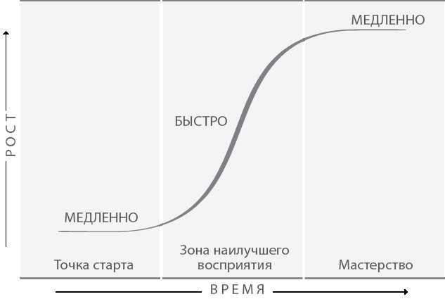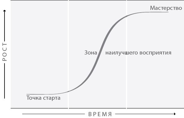 После наступления переломного момента (при условии, что он наступил) восхождение по склону S-образной кривой получает новый импульс. Этот участок называется зоной наилучшего восприятия (часть вторая). Новое еще не стало естественной частью нашей жизни, а практика носит осознанный и систематический характер. Рост ускоряется и из зерна нашей уверенности в том, что мы сможем стать теми, кем хотели стать, прорастает надежда. Так человек переходит на стадию акселератора (третья глава). Мы быстро растем.
