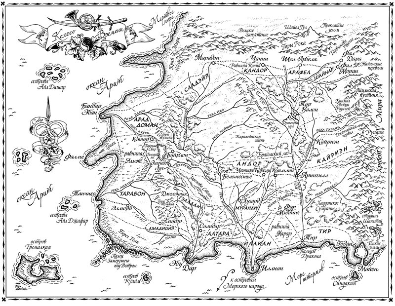 Солнце еще только начало взбираться по небосклону, и от Галада и трех его вооруженных спутников протянулись вперед длинные утренние тени. Деревья вокруг стояли густо – дубы и болотные мирты, сосны и сургамы-кислокамедники, и на большинстве виднелась рыжеватая весенняя поросль. Всадники рысью двигались по проходившей прямо через лес дороге, и Галад старался выбросить из головы все ненужное, успокоить разум, но постоянно мешала какая-то мелочь. В царящей под лесным пологом тишине раздавался лишь приглушенный стук копыт. На ветвях не чирикали птицы, не пересвистывались белки. Слишком тихо для этого времени – лес будто бы затаил дыхание и замер. Некогда, задолго до возникновения Амадиции и Тарабона, тут пролегал оживленный торговый тракт, и из-под желтоватой глины, наезженной и утоптанной до твердой корки, кое-где проглядывали остатки древних камней, которыми он был вымощен давным-давно. Вокруг, не считая всадников, не было видно ни единой живой души – только очень далеко впереди одинокую фермерскую телегу медленно тащил куда-то вол. Пути торговых караванов сместились намного севернее, деревни и фермы обезлюдели, а мифические заброшенные копи Айлгара так и оставались позабыты среди горных кряжей, нагромождения которых начинались всего в нескольких милях южнее. В той же стороне небосвода сбивались в кучу, предвещая ненастье, темнеющие облака; если они продолжат свое неспешное наступление по небу, то во второй половине дня прольется дождь. Над кромкой деревьев, вокруг прогалов у лесной опушки, выписывал петли краснокрылый ястреб. Он тоже охотится, как и сам Галад. Но действовать Галаду в своей охоте придется в душе, а не на лесной опушке.