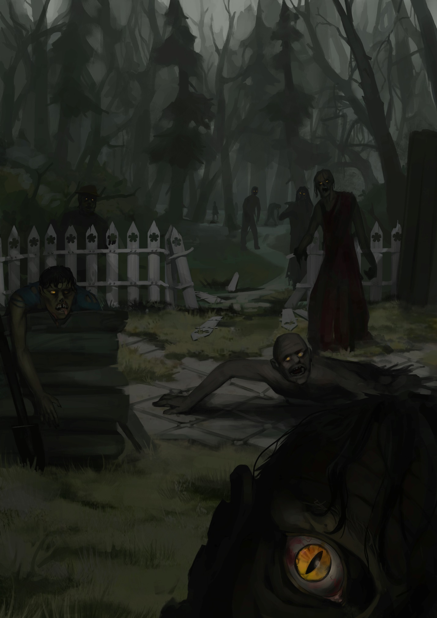 Внезапно мертвецы затихают и останавливаются. В воздухе повисает зловещая тишина. Покойники впериваются в нас янтарными глазами брата. Не к добру это. Чую опасность. Плохо.