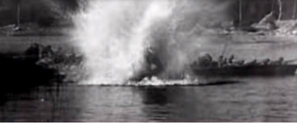 Артиллерия 99-й дивизии ЮЗФ топит лодки с немцами на реке Сан. Фото из фильма канала Россия 24: «Битва за Перемышль. Выживи сам»; vichivisam. ru.
