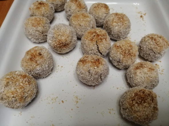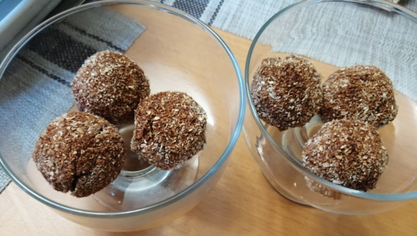– Обваливаем каждый шарик в кокосовой стружке, или в миндальной стружке, или в какао. Убираем в холодильник на 2 часа.
