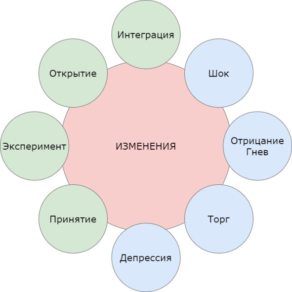Однако, ты можешь не проходить последовательно все состояния, которые возникают при изменениях. А сразу перейти к экспериментированию, к интеграции. Распечатай и положи рядом фразу в те моменты, когда ты понимаешь, что ты реагируешь на изменения и тебе надо быстрее выйти на новый уровень.