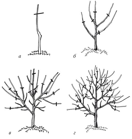 Обрезку проводят ежегодно, начиная со второго года жизни дерева. Она бывает трех типов – санитарная (удаляются сухие и поврежденные ветви), формирующая (обрезаются излишне загущенные побеги, срезаются верхушечные части ветвей, формируется необходимый вид кроны) и омолаживающая (удаляются старые побеги двух-трехлетней давности, поскольку плоды абрикоса развиваются на однолетних побегах). Санитарную и формирующую обрезку проводят весной, омолаживающую – летом, после сбора плодов. Однако нужно учитывать, что взрослые деревья не любят сильной обрезки. Поэтому формирование кроны обычно завершают к пятому году жизни дерева, а далее проводят только санитарную и омолаживающую обрезки. Примерная схема формирующей обрезки на первые пять лет приведена на рис. 5.