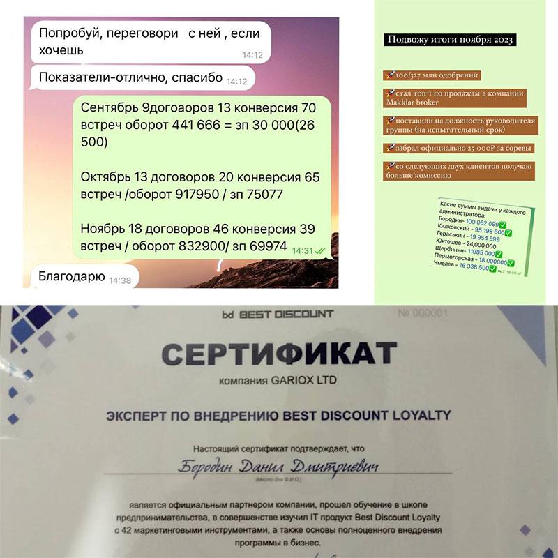 Мне есть, чем поделиться. В любых компаниях, в которых работал, я становился лучшим. Был в сетевой компании и стал ТОП-1 по продажам для предпринимателей, работал в дистанционных продажах – стал ТОП-1 (конверсия 46%) среди 26 филиалов, работал в брокерстве – стал ТОП-1 среди 7 продажников (сделал за ноябрь 2023 г. чуть больше 100 000 000 одобрений из 337 000 000).