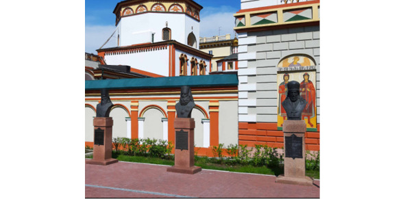 Напротив собора можно увидеть бюсты самым известным святым города Иркутска, ведь десять святых мужей благословили эту землю своей поступью: Праведный старец Герасим Иркутский, Святитель Иннокентий Кульчицкий, Преподобный Синесий Иванов, Святитель Софроний Кристалевский, Святитель Иннокентий Вениаминов, Святитель Мелетий Харьковский, Святитель Герасим Добросердов, Святитель Мелетий Якимов, Священномученики Епископ Парфений и Епископ Ефрем. Сегодня здесь всего три скульптуры, но каждый год появляются новые памятники, начиная с 2017 г., когда исполнилось 220 лет со дня рождения и 40 лет со дня канонизации апостола Сибири и Америки Иннокентия Московского. Хочется верить, что это войдет в добрую традицию.