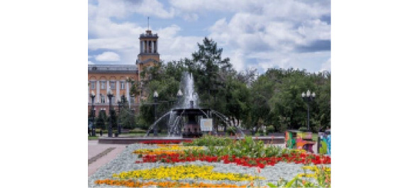 Напротив хорошо просматривается центральная доминанта площади – фонтан, который установили в сквере 1 июля 1960 г., и буквально «украли» у его создателя, который проектировал украшение специально для своего родного Курска. Сегодня это старейший из 34 фонтанов в городе. Рядом с фонтаном с западной стороны сквера можно рассмотреть макет центральной части дореволюционного Иркутска.
