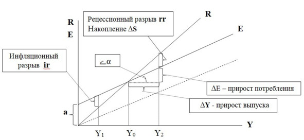 При выпуске Y1 значение дохода R меньше чем потребление E. Это вызывает инфляцию. Разница между потреблением и выпуском в данной точке называется инфляционный разрыв (ir).