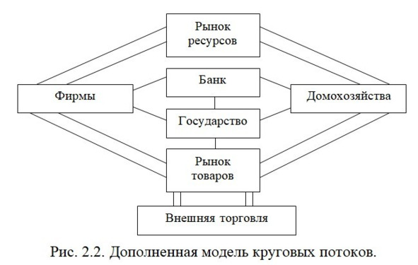 В действительности модель круговых потоков имеет более сложный вид. Он отражает движение товаров и денег на рынке. Кроме того, модель включает в себя государство и банки, которые могут изменять количество денег на рынке и, таким образом поддерживать равновесие. Эта модель отражена на рис. 2.2.