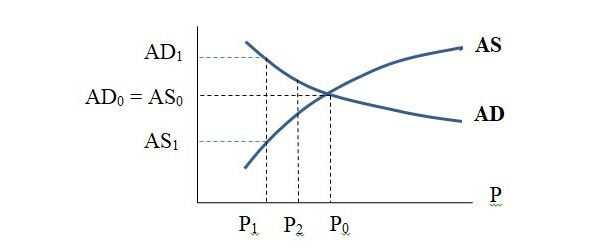 Понимать эту модель нужно следующим образом. Кривая AD представляет собой графическое отображения закона спроса: чем выше цена Р, тем ниже спрос. Кривая AS, это – отображение закона предложения: чем выше цена Р, тем выше предложение. Точка пересечения этих кривых даёт значение равновесной цены Р0 и равновесной вели чины спроса AD0 и предложения AS0.